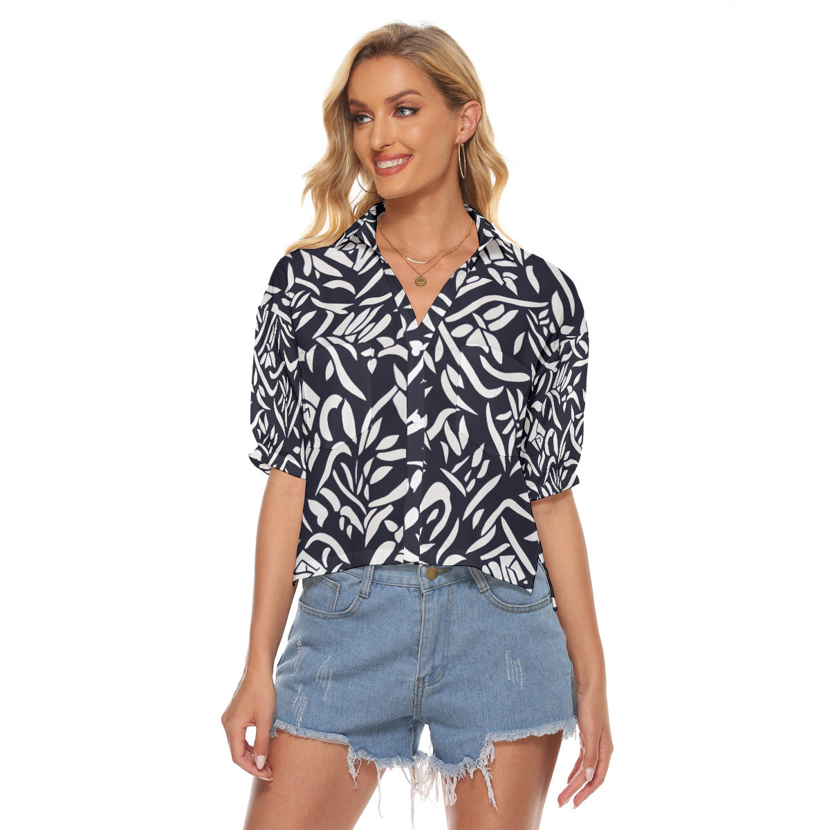 - V-neck, breast pocket, side slit